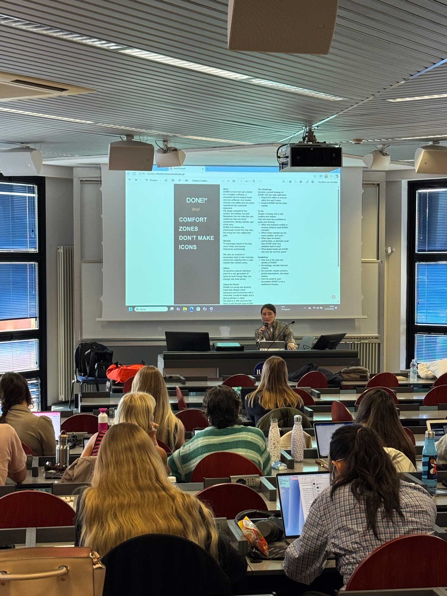In 2024, DONE! was chosen as the reference brand for a strategy course at IULM University of Milan, offering students the opportunity to engage with a real entrepreneurial project. The brand was presented as the starting point for the development of the course’s project work, allowing students to apply in a practical way the tools and models studied during lessons.